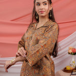 Cotton Brown Digital Printed Work Wear Co Ord Set With Pintuck Detailing On Sleeves
