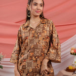 Cotton Brown Digital Printed Workwear Co Ord Set With Pintuck Detailing On Sleeves