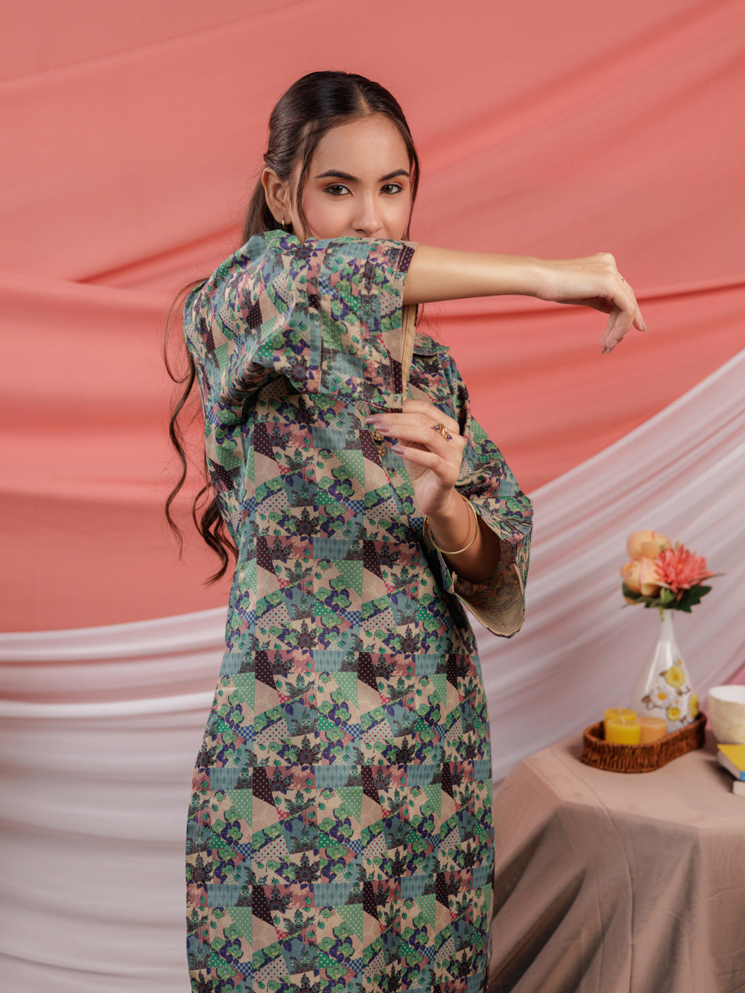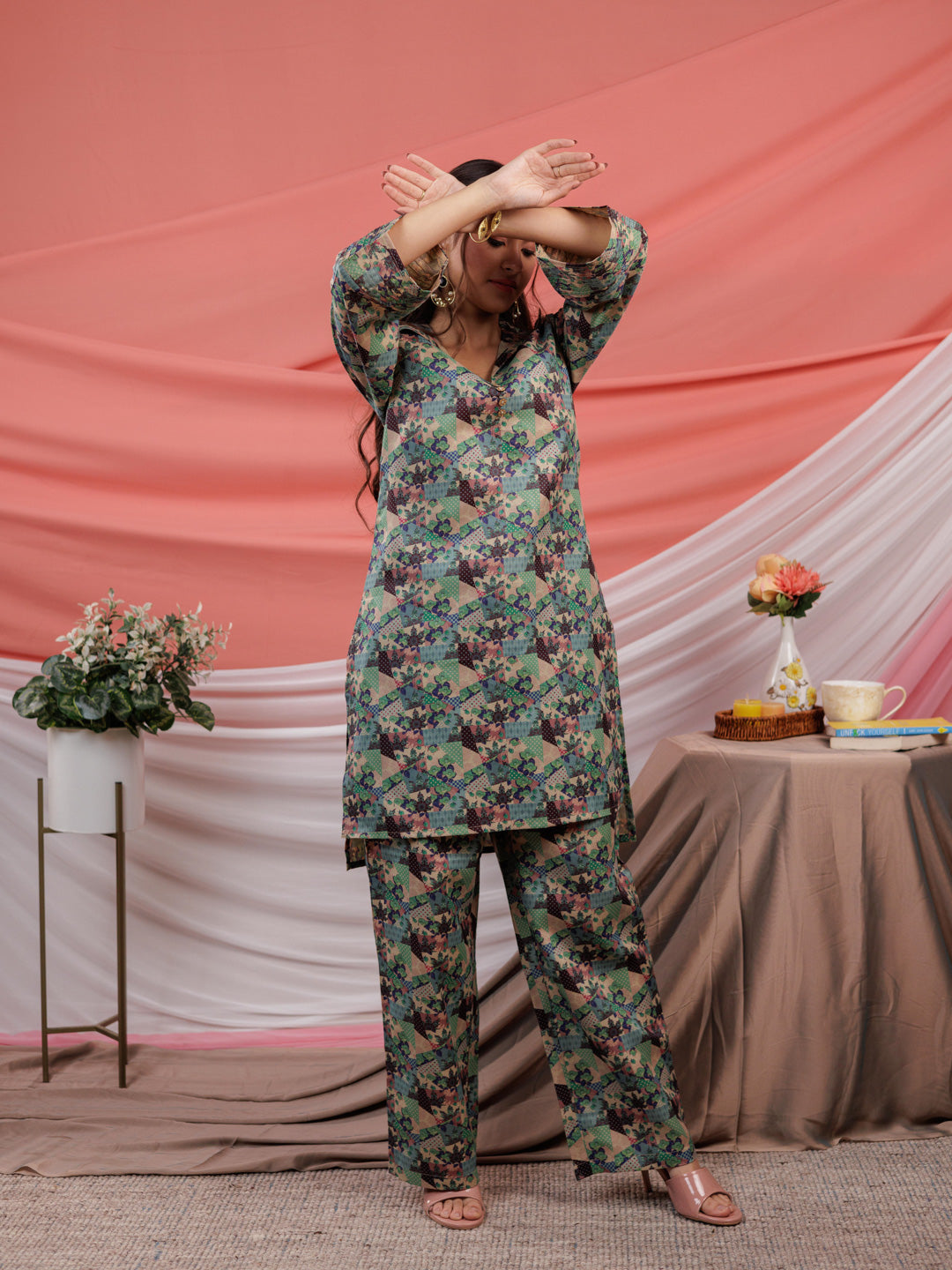 Cotton Digital Printed Blue Workwear Kurta Co Ord Set With Pintuck Detailing