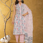 White Floral Print Cotton Straight Kurta And Trouser with dupatta Set