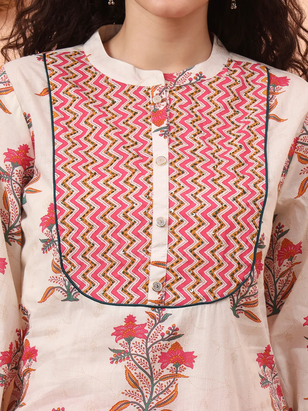 Cream Pure Cotton Kantha Work Kurta Dupatta Pant Set