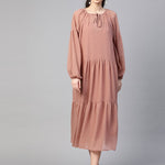 Dusty Pink Tiered Maxi Dress with Inner, in Swiss Dobby fabric, Polyknit Camisole, Full Length , Comfort Fit, Tie Up At Centre Front, Flared Hemline and features Gather Detail At Neck
