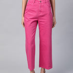 Fuchsia Raw Edge Jeans, in Denim fabric, Unlined, Full Length, Comfort Fit, Button Closure, Straight Hemline and features Raw Edge Detail At Hem