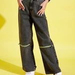 Black Acid Wash Front Zipper Straight Jeans, in Denim fabric, Unlined, Ankle Length, Straight Fit, Button Closure, Straight Hemline and features Neon Colour Zipper Detail At Knee