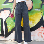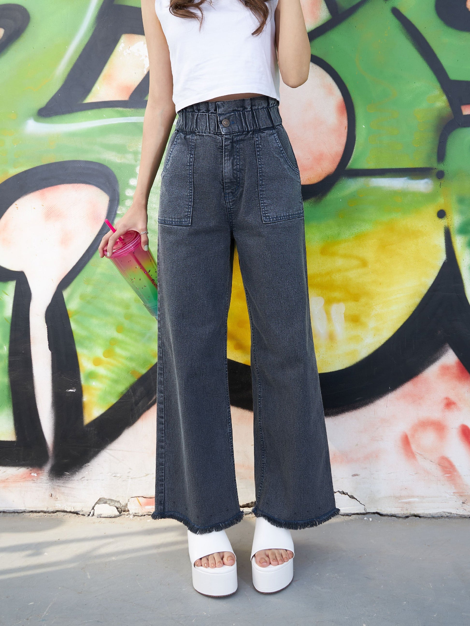 Black Acid Wash Paper Bag Straight Jeans, in Denim fabric, Unlined, Full Length, Comfort Fit, Button Closure, Straight Hemline and features Paper Bag Waist