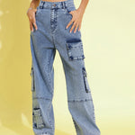 Blue Acid Wash Multi Pockets Straight Jeans, in Denim fabric, Unlined, Full Length, Straight Fit, Button Closure, Straight Hemline and features Multi Pocket Detail
