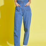 Blue Paper Bag Waist Carrot Jeans, in Denim fabric, Unlined, Ankle Length, Carrot Fit, Button Closure, Straight Hemline and features Patch Pocket Detail At Front
