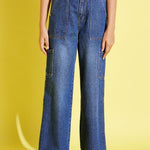 Blue Patch Pocket Straight Jeans, in Denim fabric, Unlined, Ankle Length, Straight Fit, Button Closure, Straight Hemline and features Patch Pocket Detail At Side
