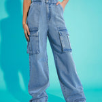 Ice Blue Acid Wash Elasticated Waist Cargo Jeans , in Denim fabric, Unlined, Full Length, Straight Fit, Button Closure, Straight Hemline and features Elasticated Waistband Detail
