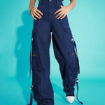 Navy Blue Acid Wash Side Tape Cargo Jeans, in Denim fabric, Unlined, Full Length, Straight Fit, Button Closure, Straight Hemline and features Multi Pocket Detail At Side