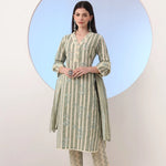 Green And Cream Striped Straight Thread Work Kurta And Trouser With Dupatta Set