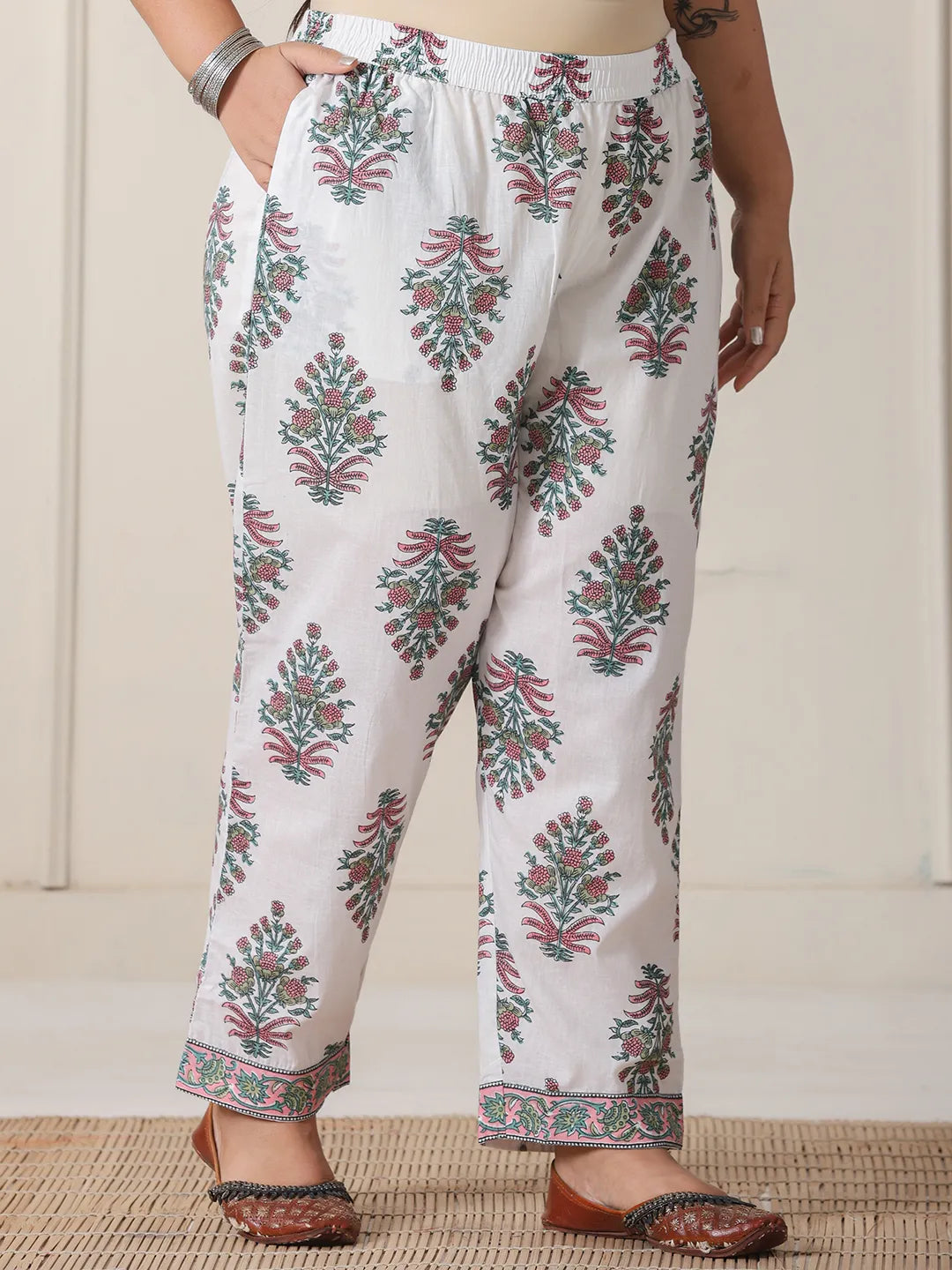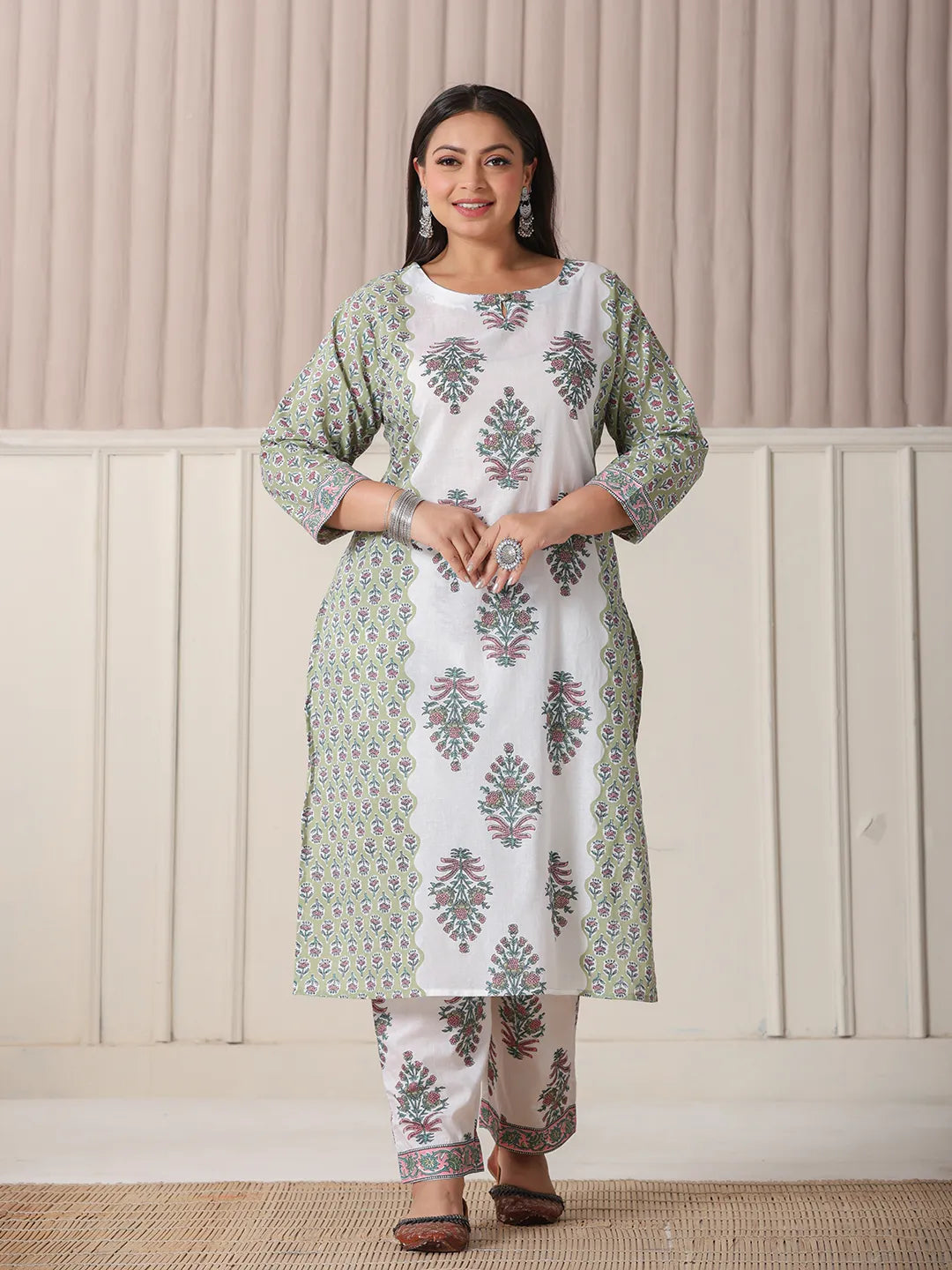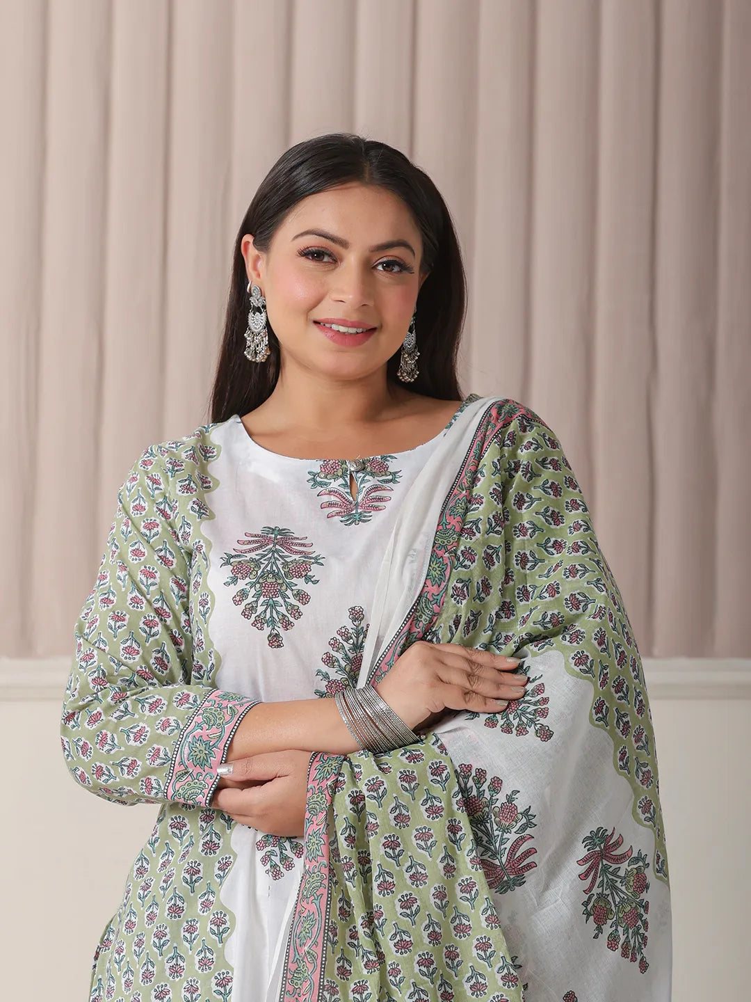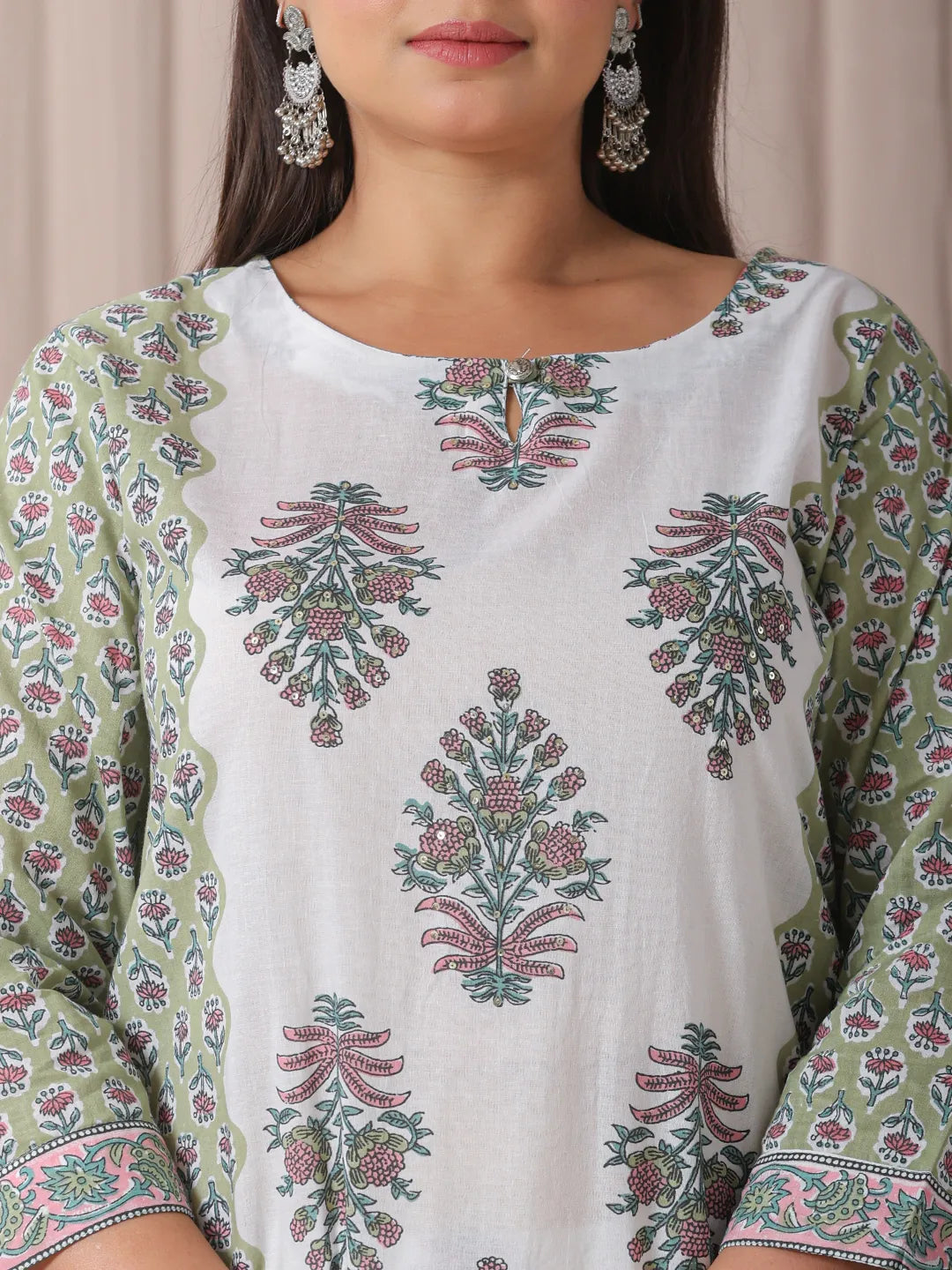 Green And White Hand Embroidery Cotton Plus Size Kurta Dupatta Set