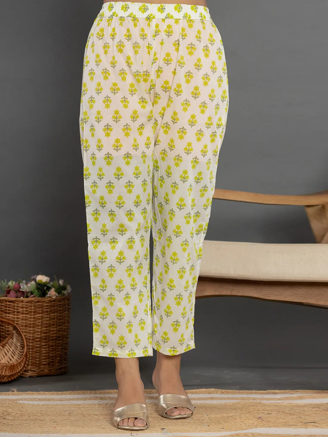 Green Beads & Stones Cotton Anarkali Kurta Dupatta Pant Set