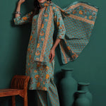 Green Cotton Floral Print Piping Kurta Pants Dupatta Set