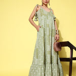 Green Ethnic Motifs Print Cotton A Line Maxi Dress