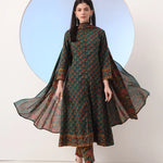 Green, red and brown coloured kurta with trousers and dupatta