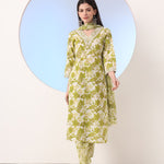Green Floral Print Straight Thread Work Kurta And Trouser With Dupatta Set