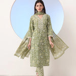 Green Floral Print Straight Zari Work Kurta And Trouser With Dupatta Set