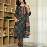 Green Pure Cotton Ethnic Motifs Kantha Work Kurta Dupatta Pant Set