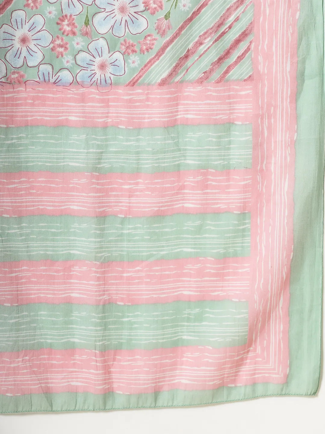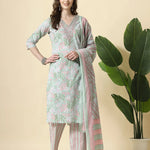 Green Pure Cotton Floral Print Thread Work Kurta Set With Pant & Dupatta