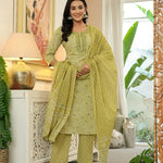 Green Pure Cotton Thread Work Sequins Work Kurta Dupatta Pant Set