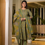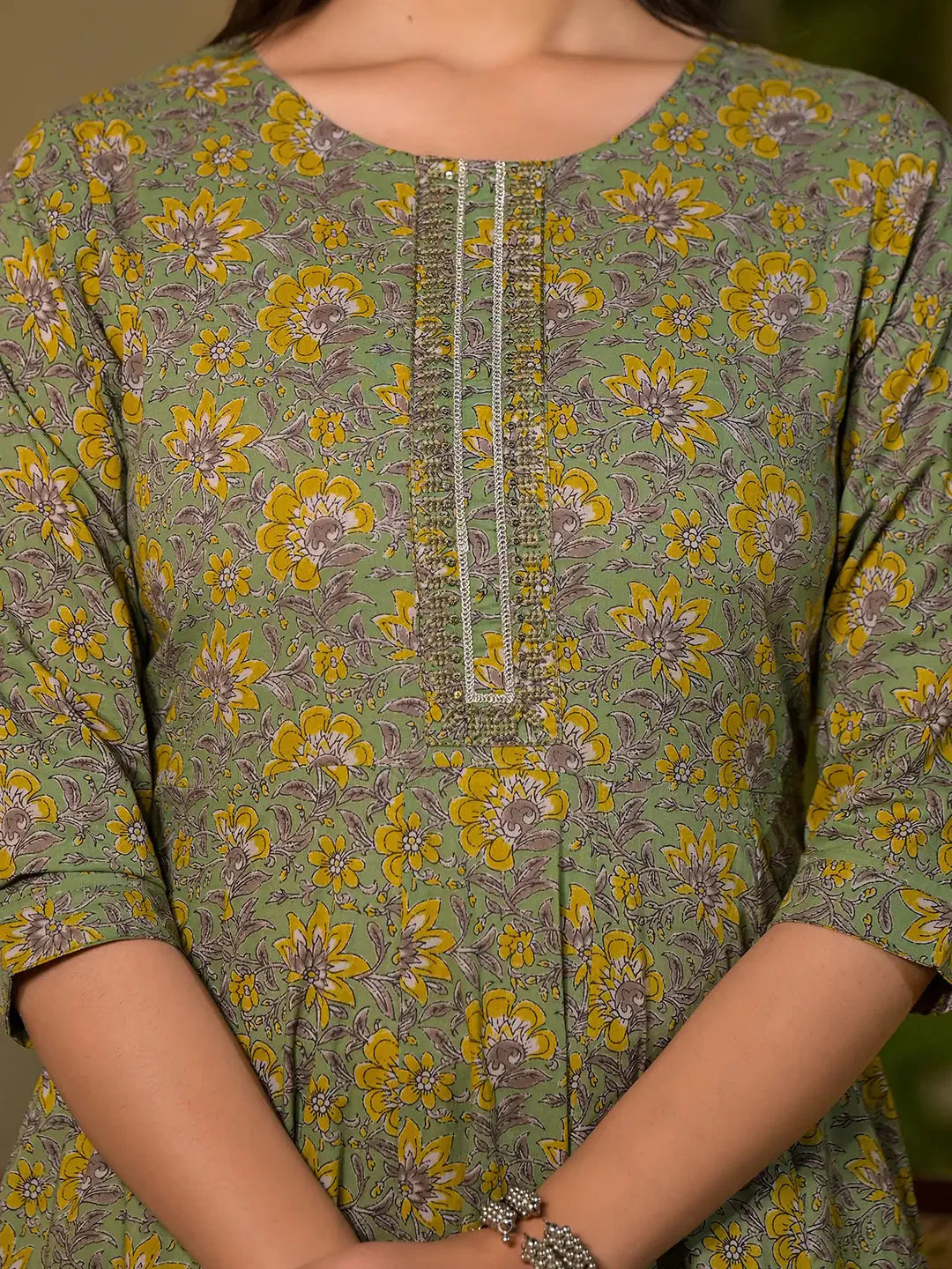 Green Thread Work Cotton Anarkali Style Kurta And Trousers With Dupatta Set
