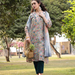 Grey Floral Print linen A Line Have A Lining Kurta Trouser Dupatta Set