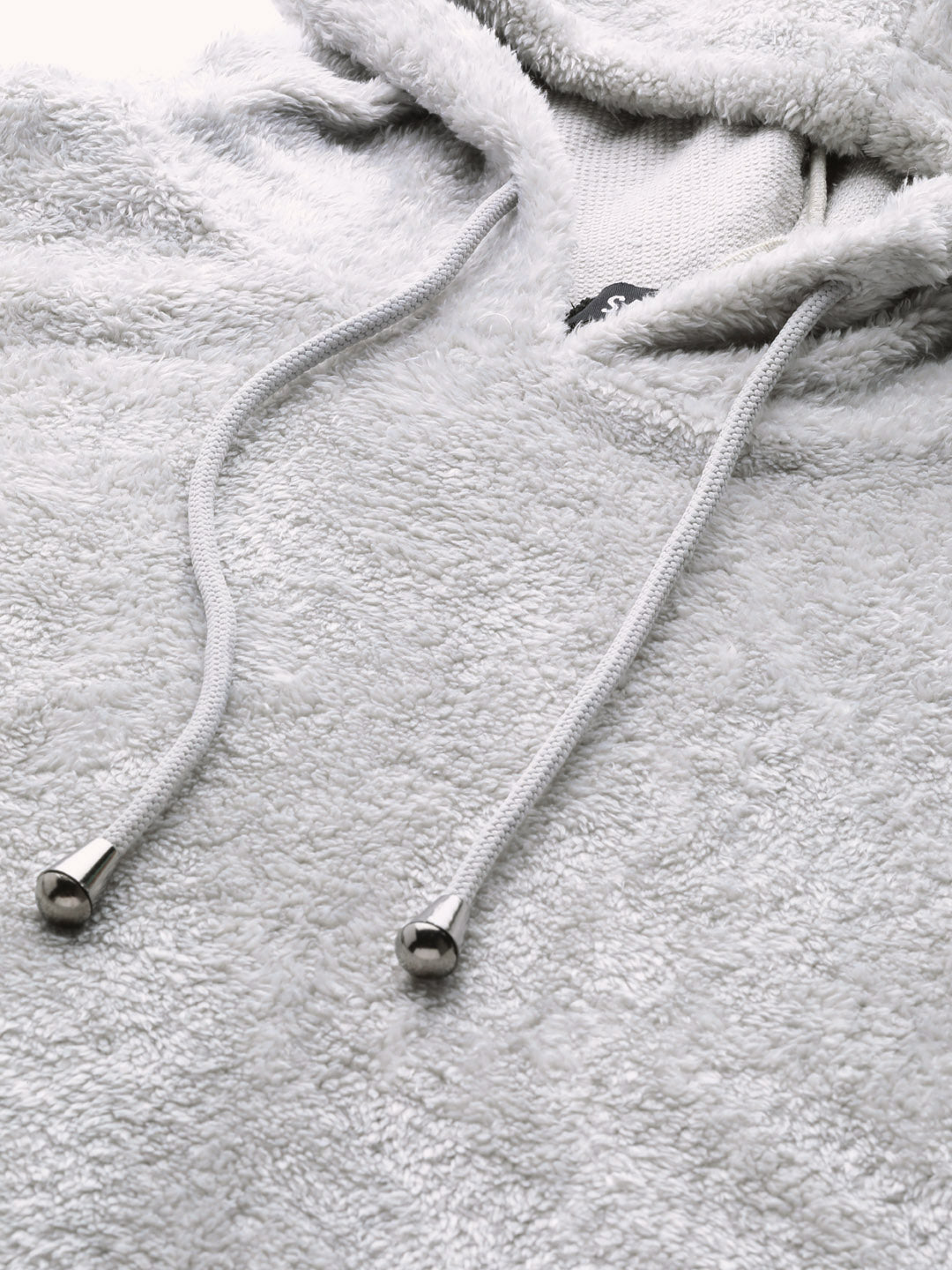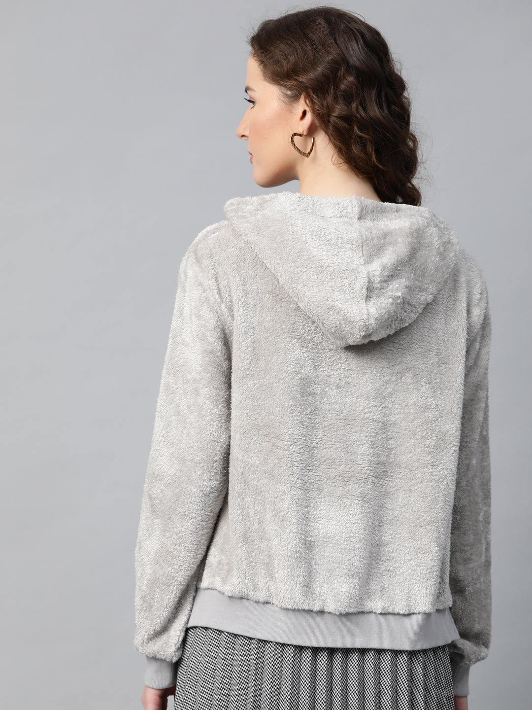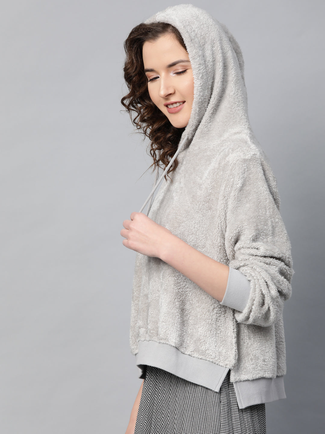 Grey Hooded Faux Fur Sweatshirt, in Fur fabric, Unlined, Regular Length, Comfort Fit, Drawstring Closure, Straight Hemline and features Slit At Side