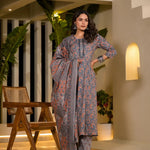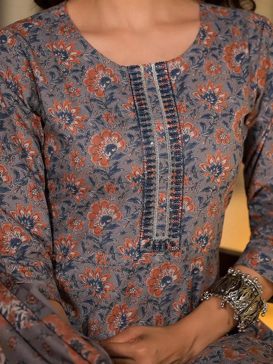 Grey Thread Work Cotton Anarkali Style Kurta And Trousers With Dupatta Set
