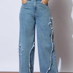 Ice Blue Front Distrace Straight Jeans, in Denim fabric, Unlined, Full Length , Straight Fit, Button Closure, Straight Hemline and features Star Patch Detail At side