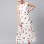 Ivory Floral Halter Maxi, in Georgette fabric, Polyknit Lining, Maxi, Fit & Flare, Side Zipper, Straight Hemline and features Ladder Lace Detail At Front