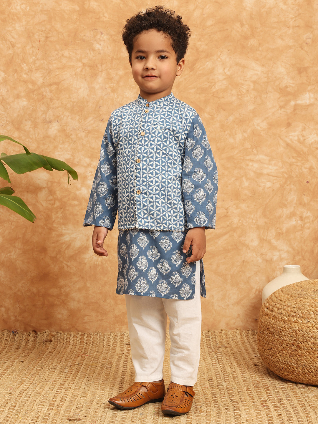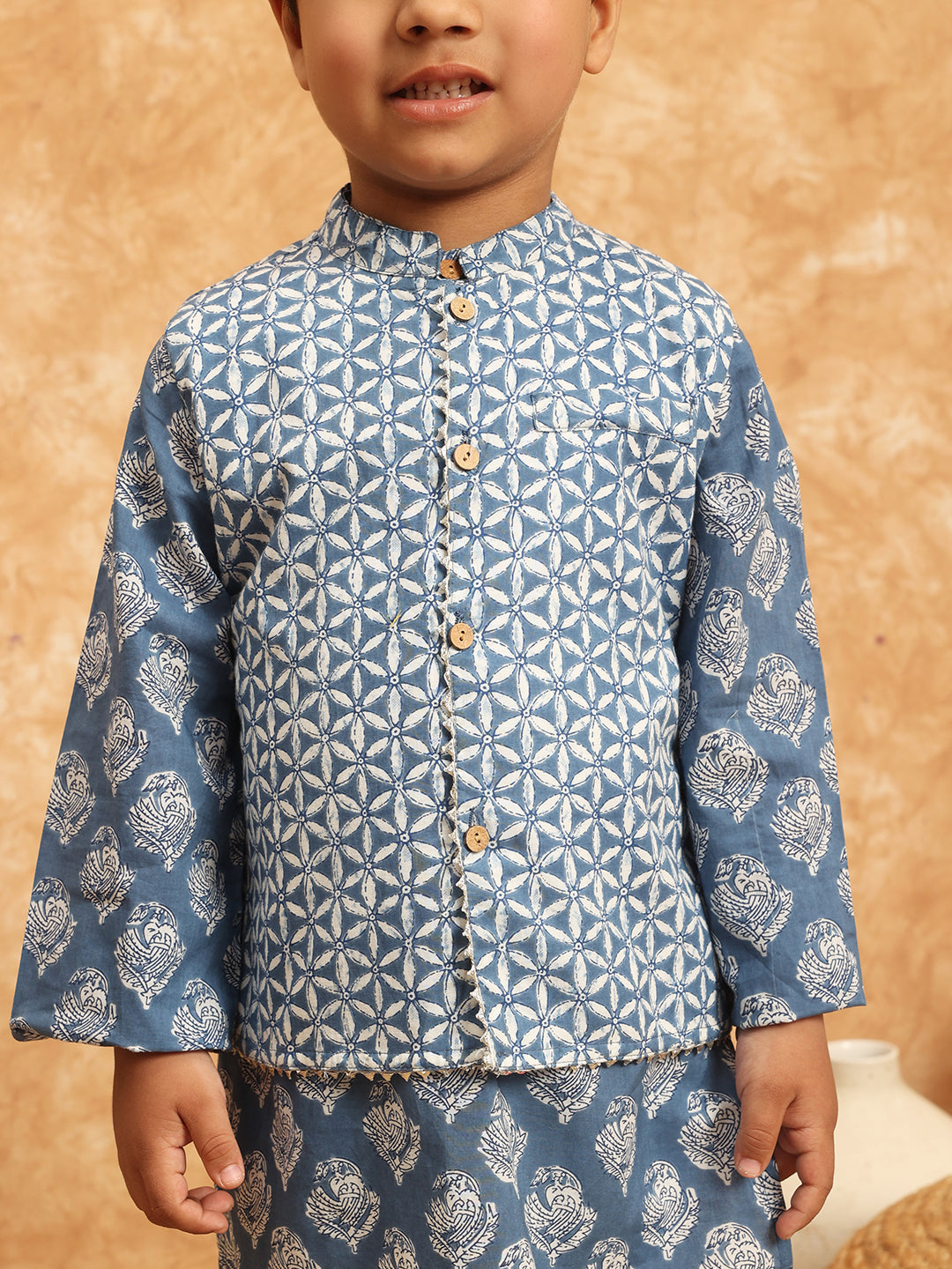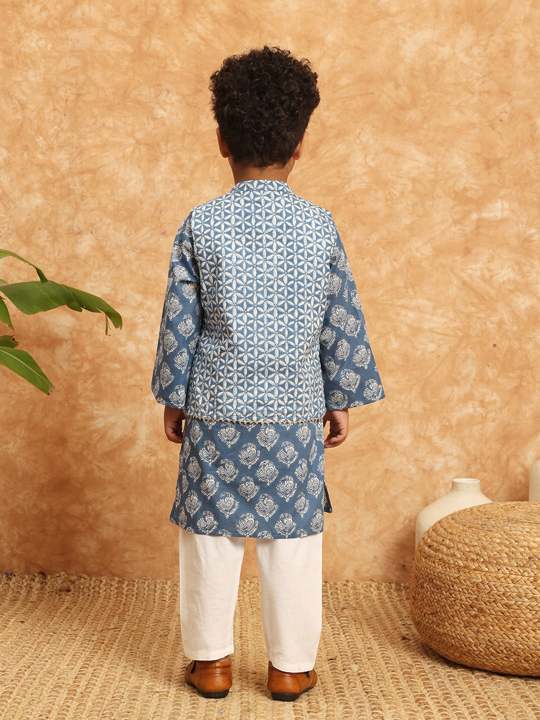Straight Style Cotton Fabric Blue Color Printed Kurta And Pajama With Jacket In Gota Work