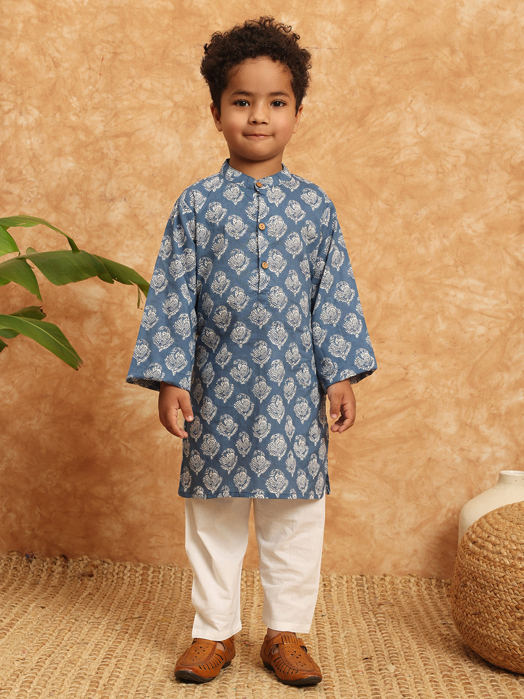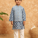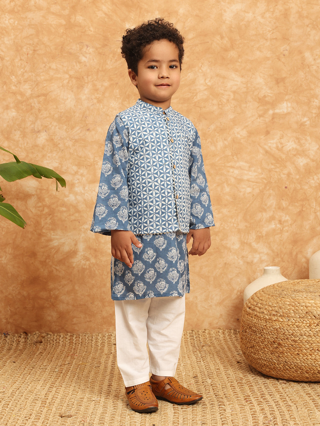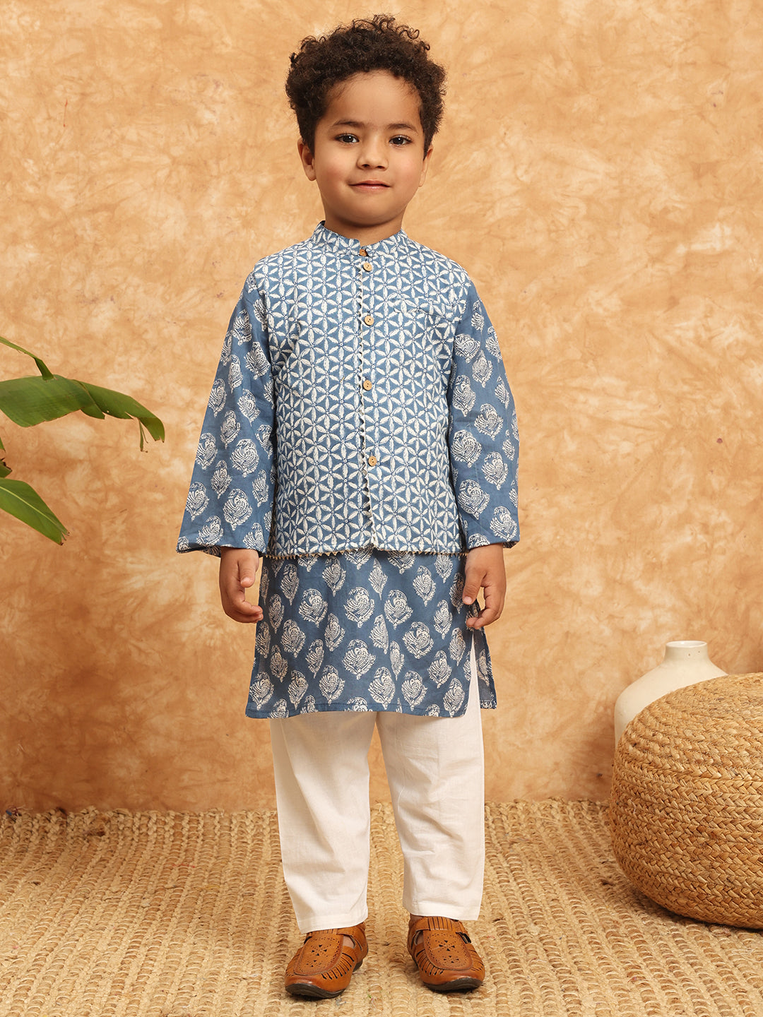 Straight Style Cotton Fabric Blue Color Printed Kurta And Pajama With Jacket In Gota Work
