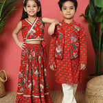 Boys Straight Style Cotton Fabric Red Color Floral Printed Kurta With Attached Jacket And Pyjama