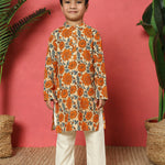 Boys Straight Style Cotton Fabric Orange Color Floral Printed Kurta With Pyjama