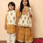 Boys Straight Style Cotton Fabric Mustard Color Floral Printed Kurta And Pyjama With Nehru Jacket