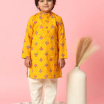 Boys Straight Style Cotton Fabric Orange And Cream Color Floral Printed Kurta And Pyjama
