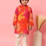Boys Straight Style Cotton Fabric Orange Color Floral Printed Kurta With Pyjama