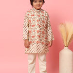 Boys Straight Style Cotton Fabric Cream Color Floral Printed Kurta With Pyjama And Nehru Jacket