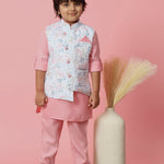 Boys Straight Style Cotton Fabric Pink Color Kurta With Trouser And Floral Printed White Jacket