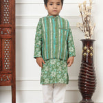 Boys Straight Style Cotton Fabric Green Color Printed Kurta And White Color Pyjama With Nehru Jacket