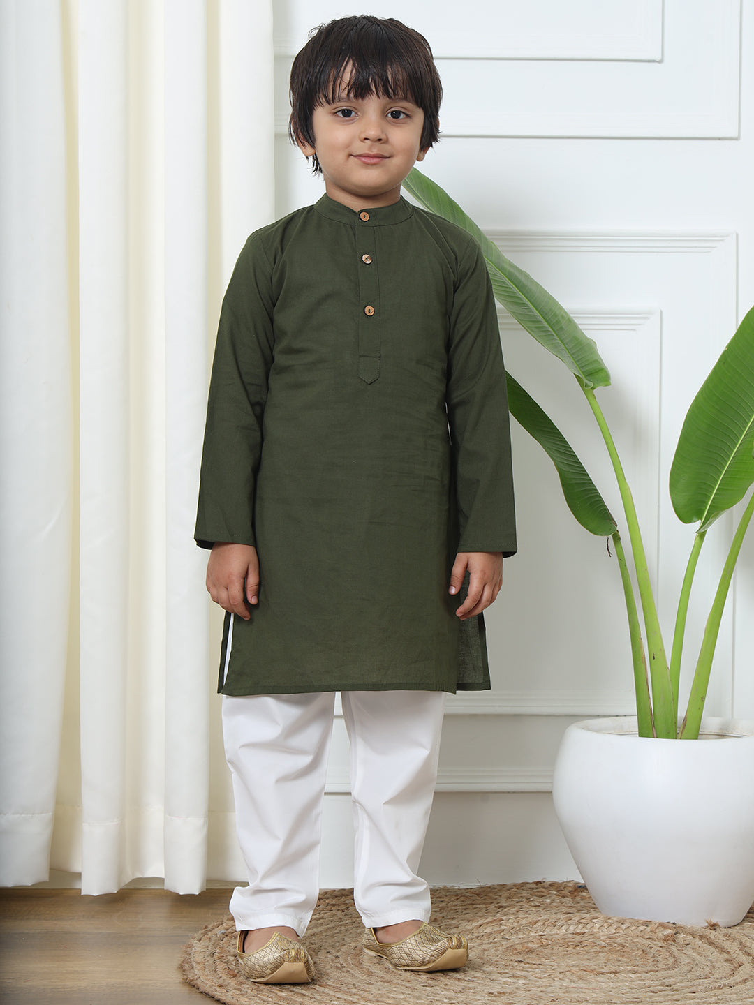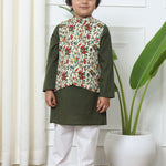 Boys Straight Style Cotton Fabric Green Color Kurta And White Pyjama With Printed Nehru Jacket