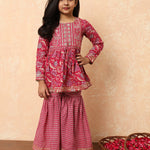 Girls Frock Style Cotton Fabric Pink Color Printed Kurti And Sharara With Sequin And Zari Work