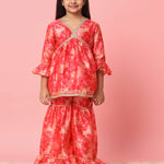 Girls Frock Style Art Silk Fabric Red Color Floral Printed Kurti And Sharara With Gotta Lace Work