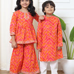 Girls Frock Style Cotton Fabric Orange Color Bandhej Kurti And Sharara With Gotta Lace Work
