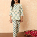 Straight Style Cotton Fabric Teal Color Floral Printed Kurti And Pyjama With Gotta Lace Work