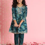 Frock Style Cotton Fabric Teal Color Floral Printed Kurti And Pyjama With Gotta Lace Work