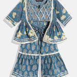 Frock Style Cotton Fabric Blue Color Floral Printed Top And Sharara With Gotta Work