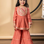 Girls Peplum Style Roman Silk Fabric Peach Color Kurti With Sharara