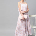 Lavender Floral Strappy Pleated Maxi Dress, in Poly Crepe fabric, Polyester Lining, Full Length, Comfort Fit, Elastic At Waist, Flared Hemline and features Pleated Frill Layer On Bodice